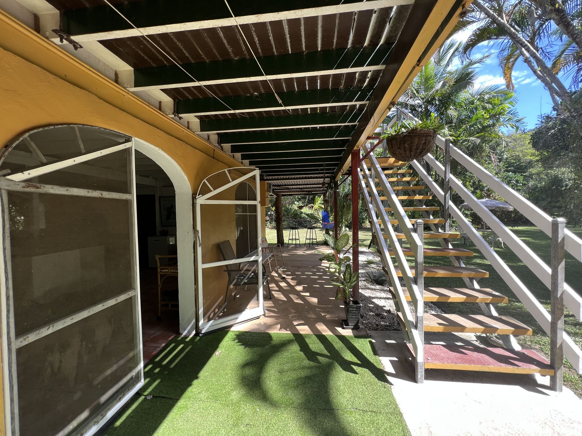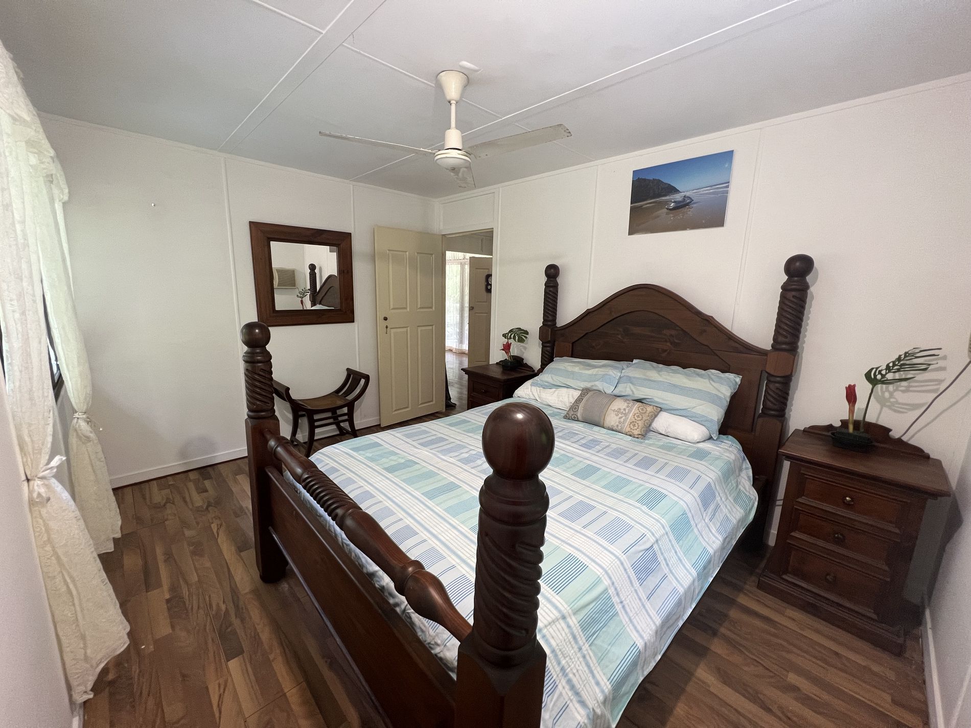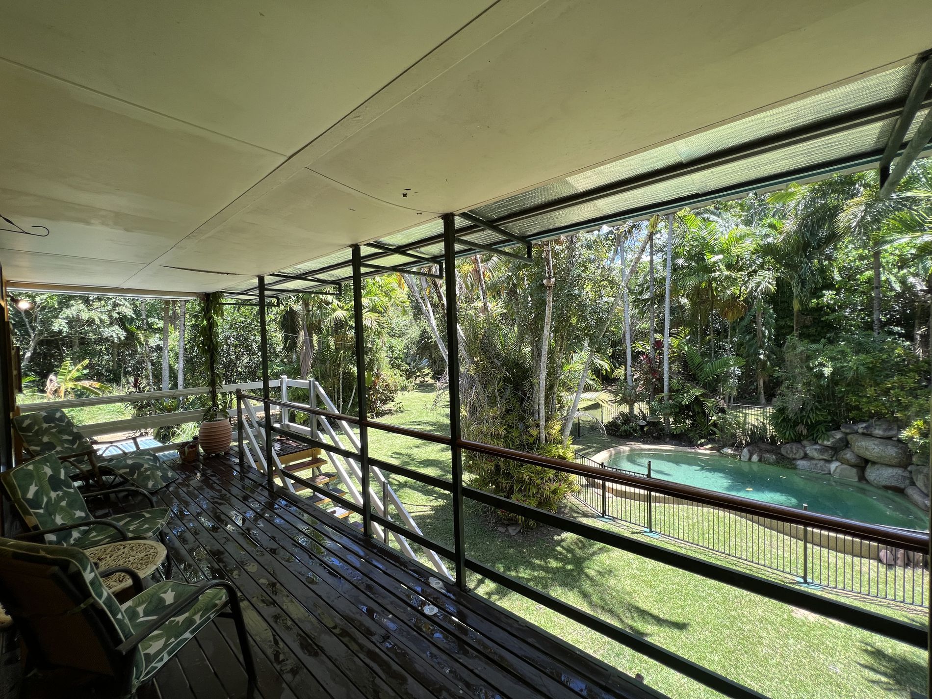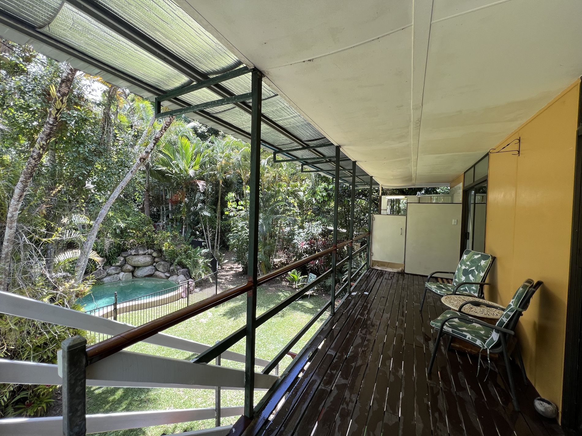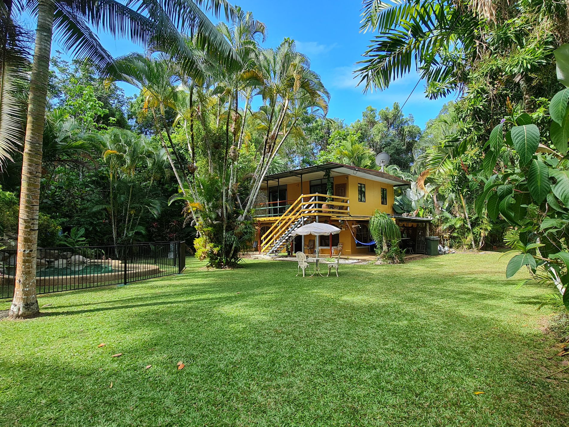 Upstairs presents 2 large bedrooms with air conditioning. The living area and main bedroom have access to the veranda that overlooks the pool and gardens. A second bathroom at the end of the upstairs veranda includes a shower, toilet, and basin.