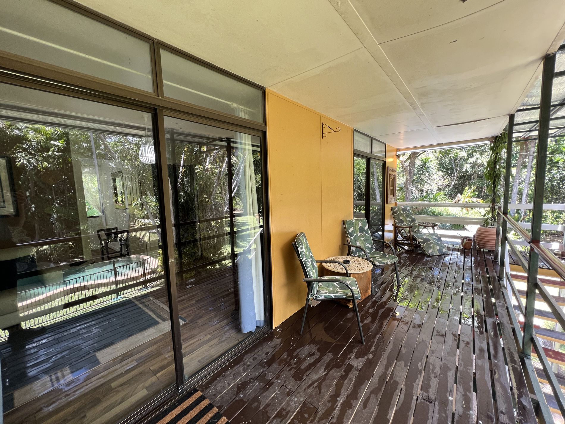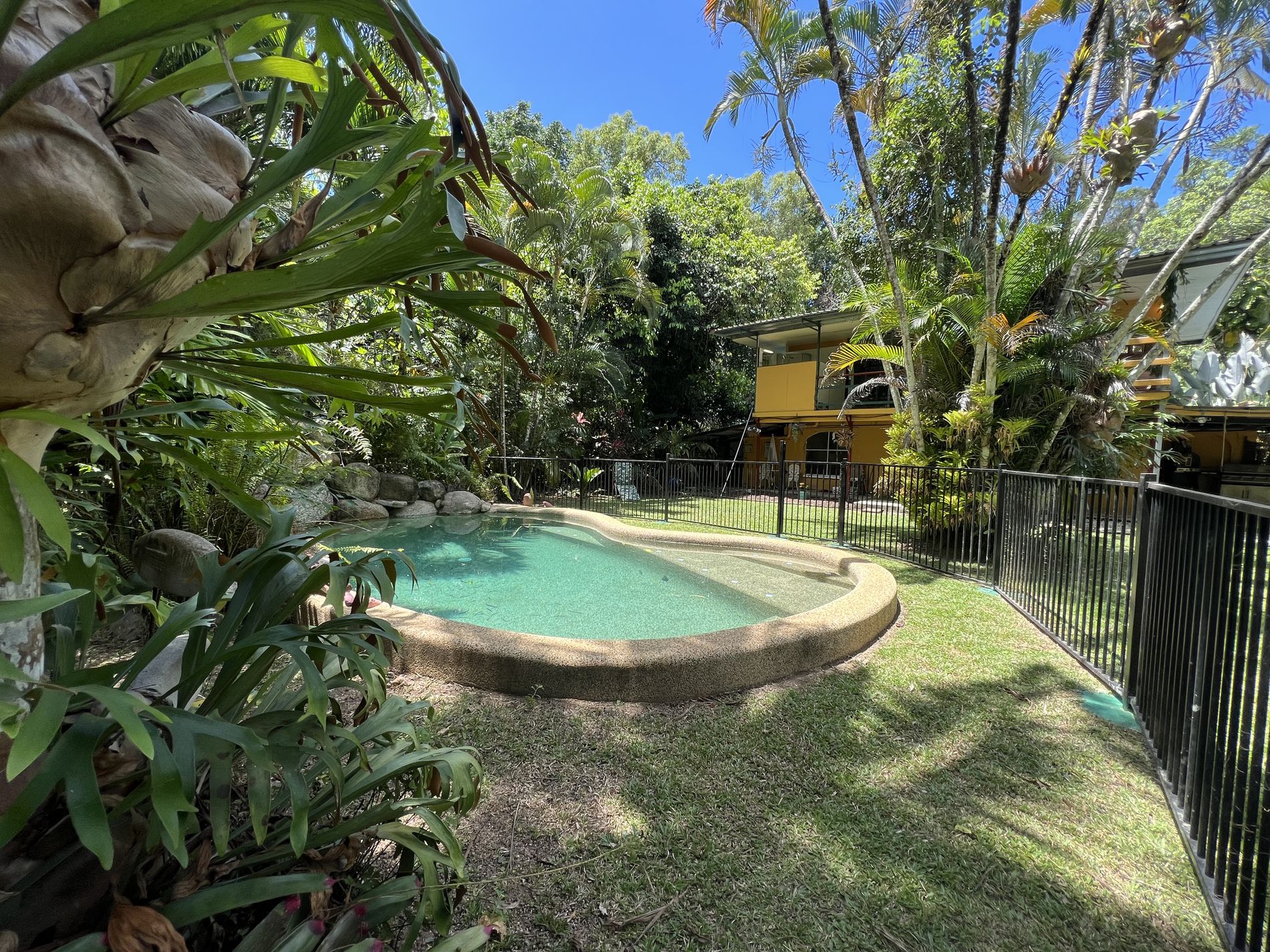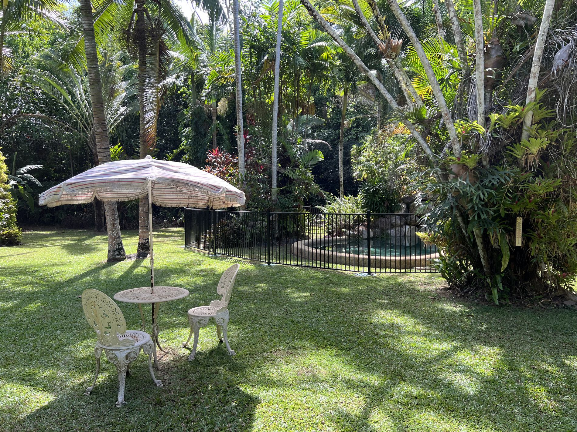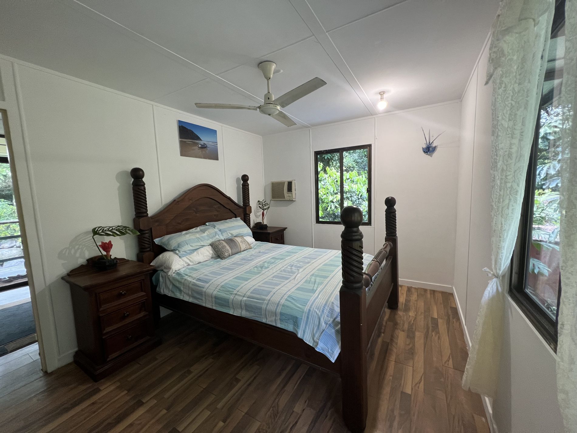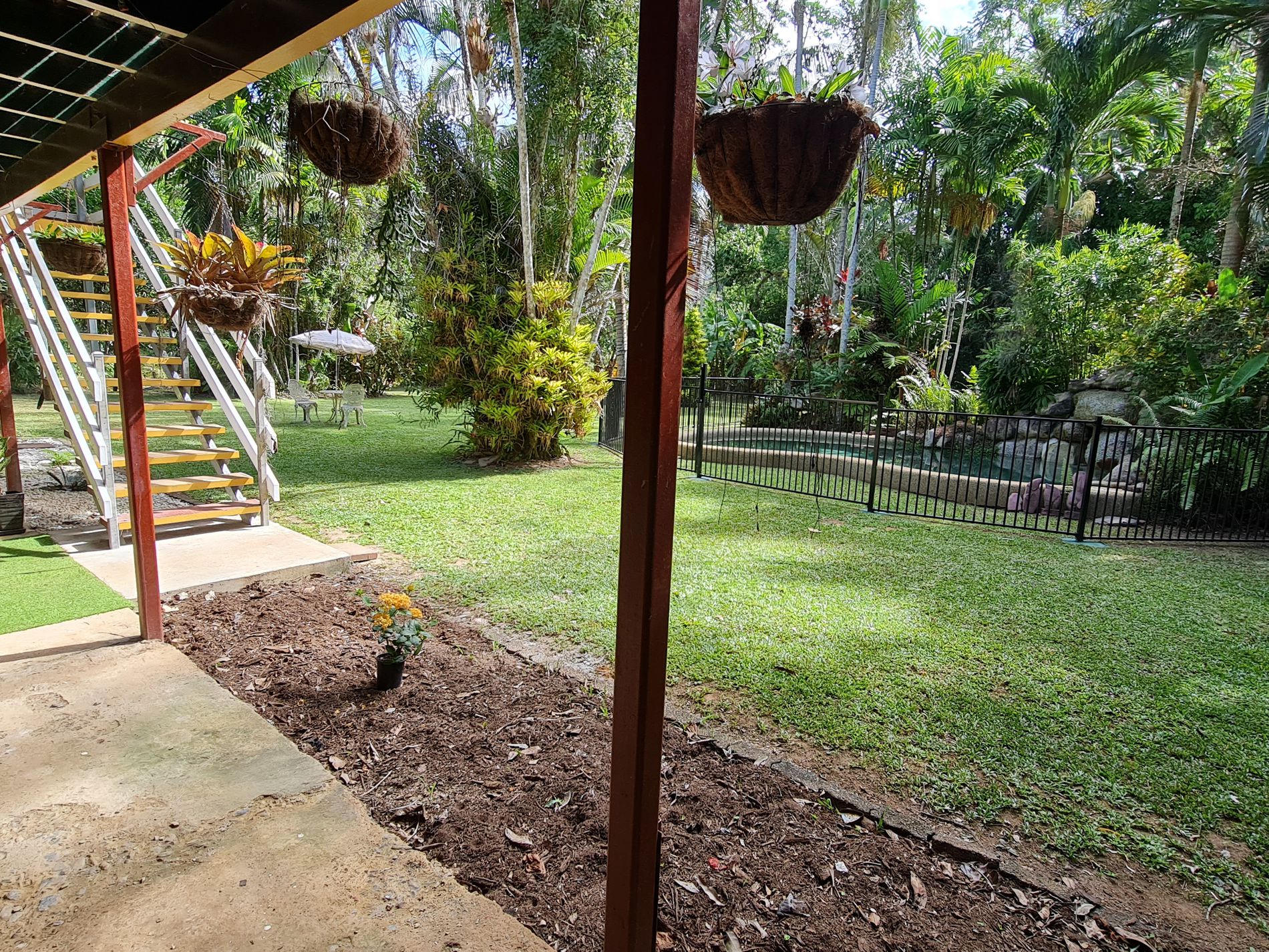Upstairs presents 2 large bedrooms with air conditioning. The living area and main bedroom have access to the veranda that overlooks the pool and gardens. A second bathroom at the end of the upstairs veranda includes a shower, toilet, and basin.