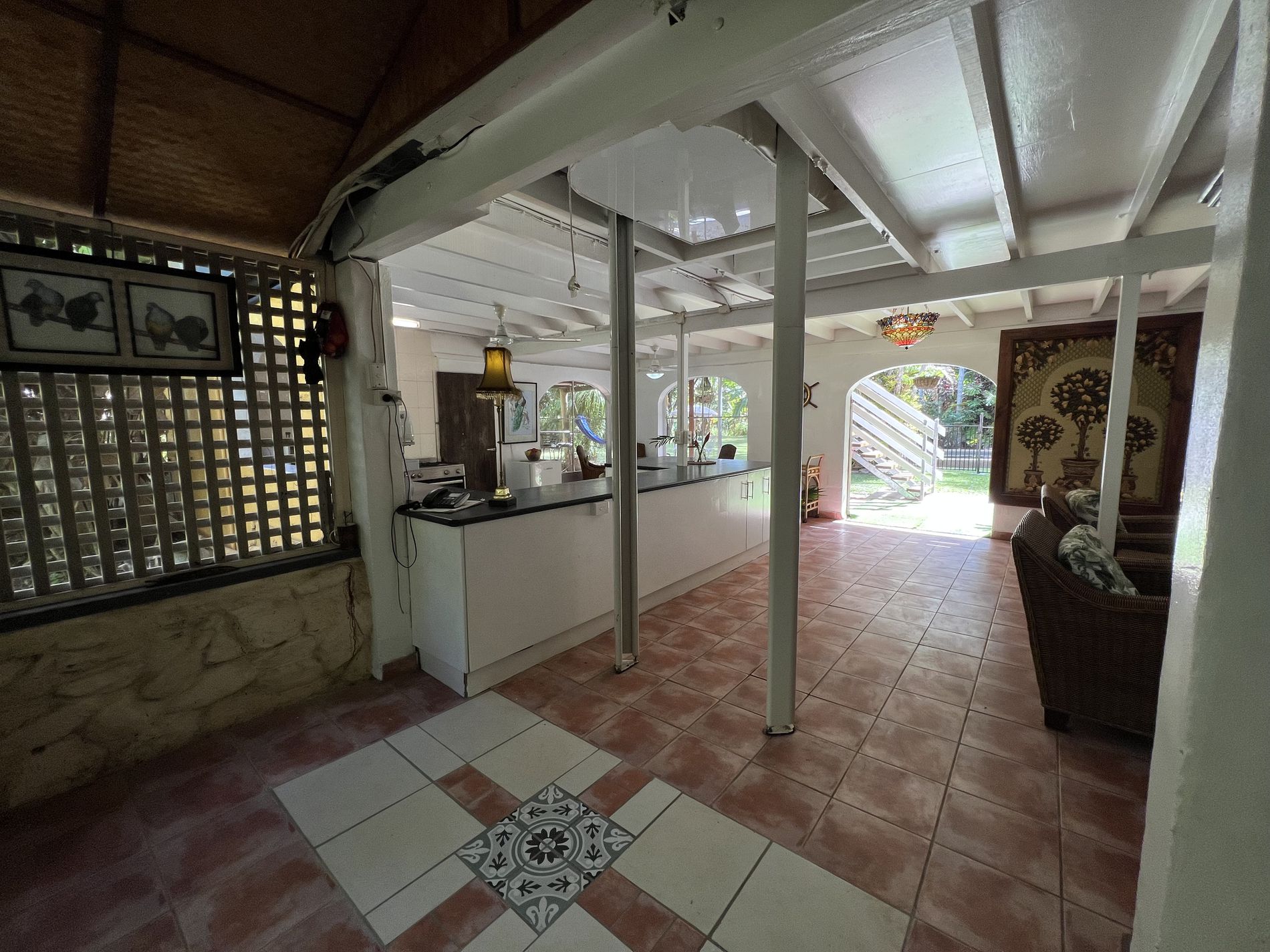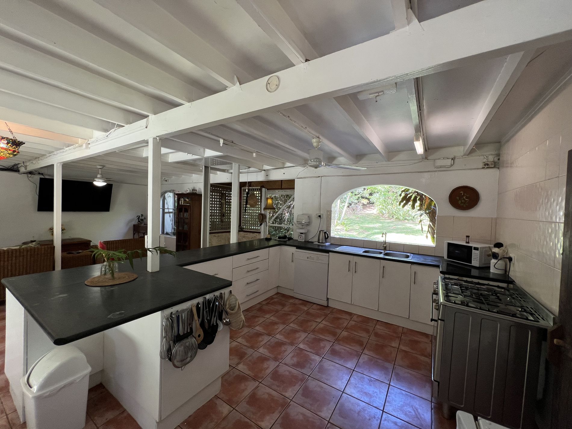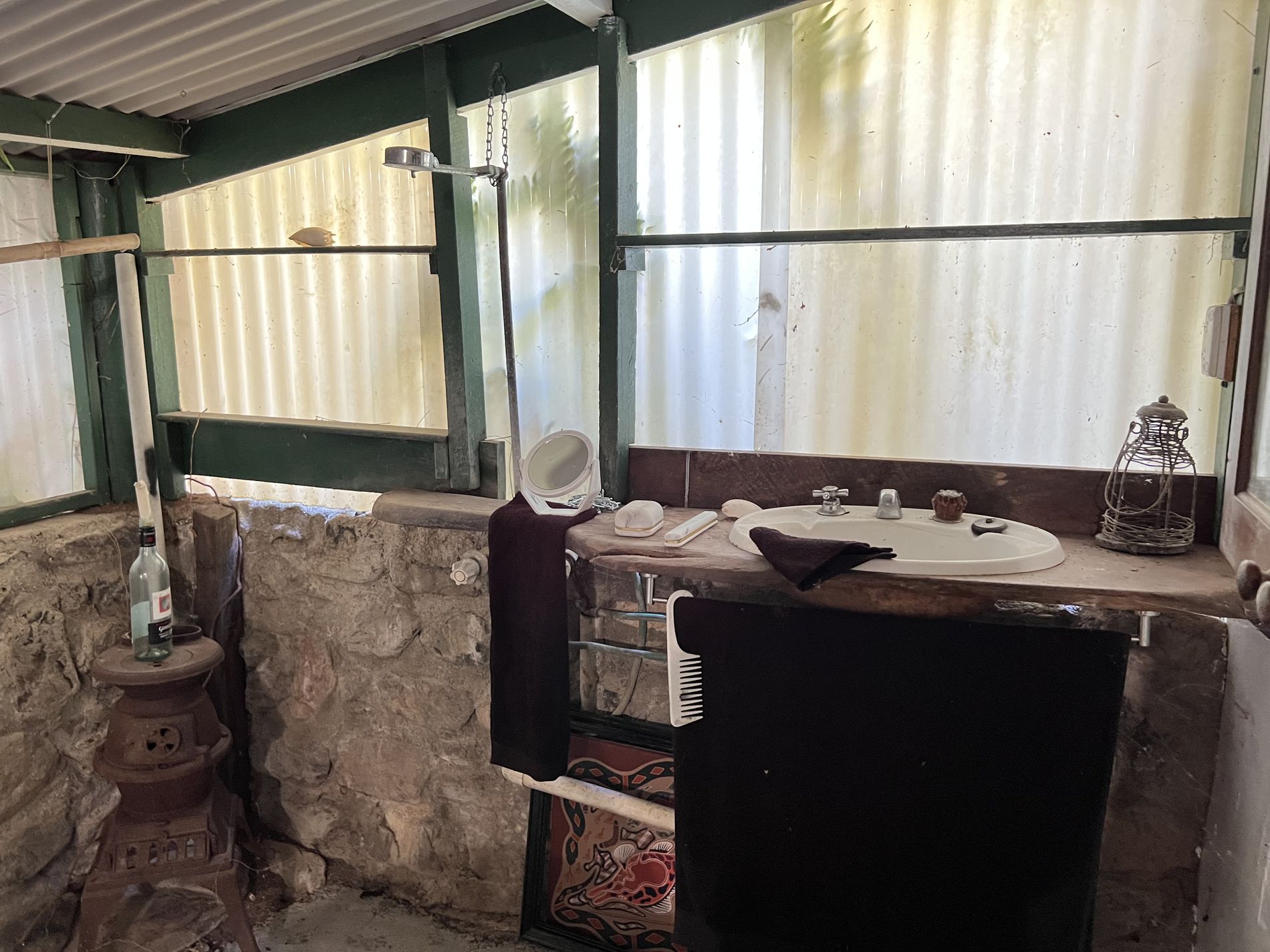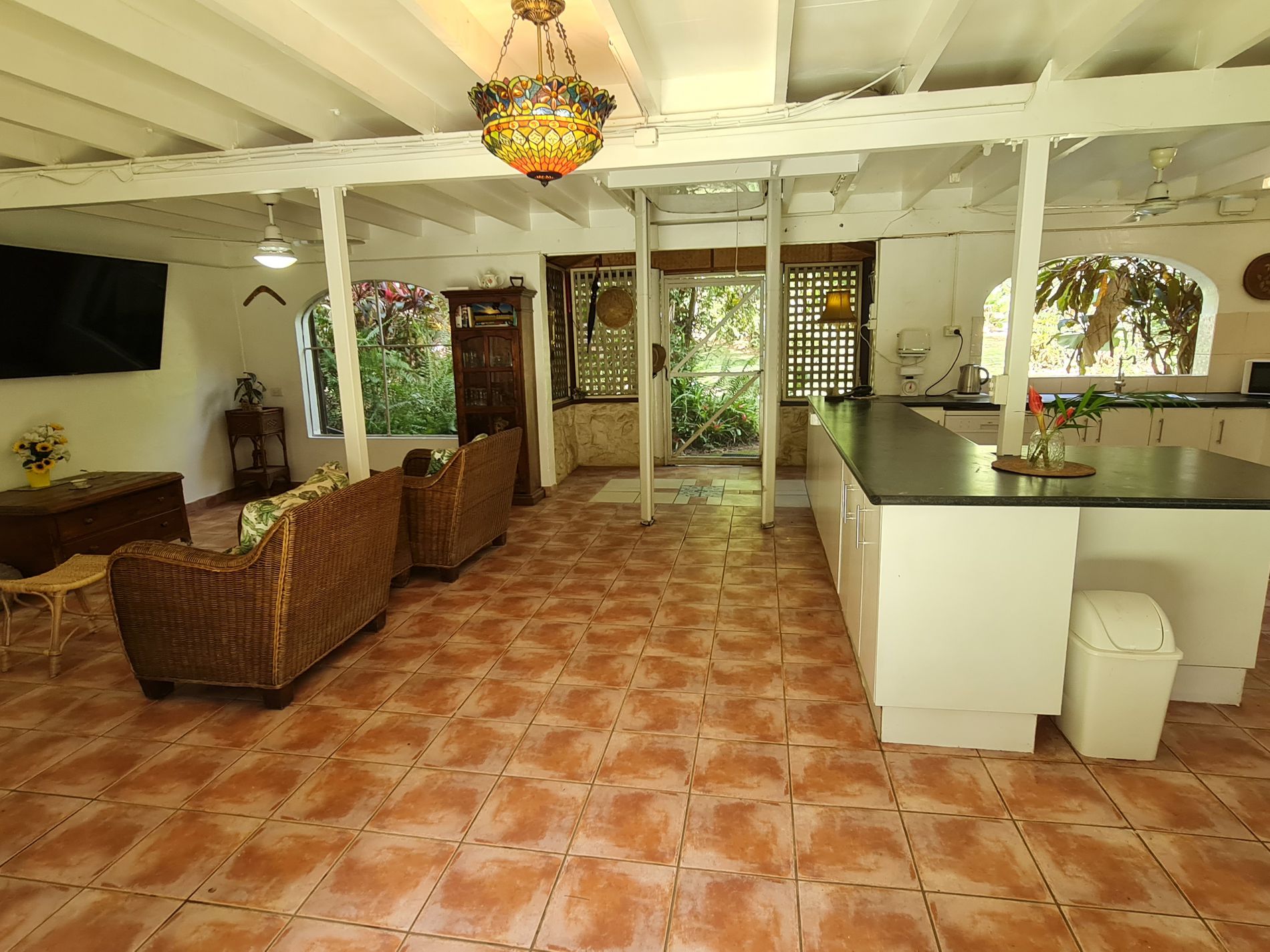 The lower level is constructed with block on a concrete slab with large windows to allow breezes to flow through keeping it cool and catch the natural light. Downstairs also offers open plan living for kitchen, dining, and the lounge. The kitchen has a dishwasher, large 5 burner gas stove surrounded by cupboards for storage or room for a breaky bar. In addition, the walk-in pantry has its own air-compressor pumping cold air and the temaperature can be adjusted to your liking, (similar to a cold room) for optimum storage. Adjacent to the downstairs area is the laundry, separate toilet and charming bathtub and surrounds.