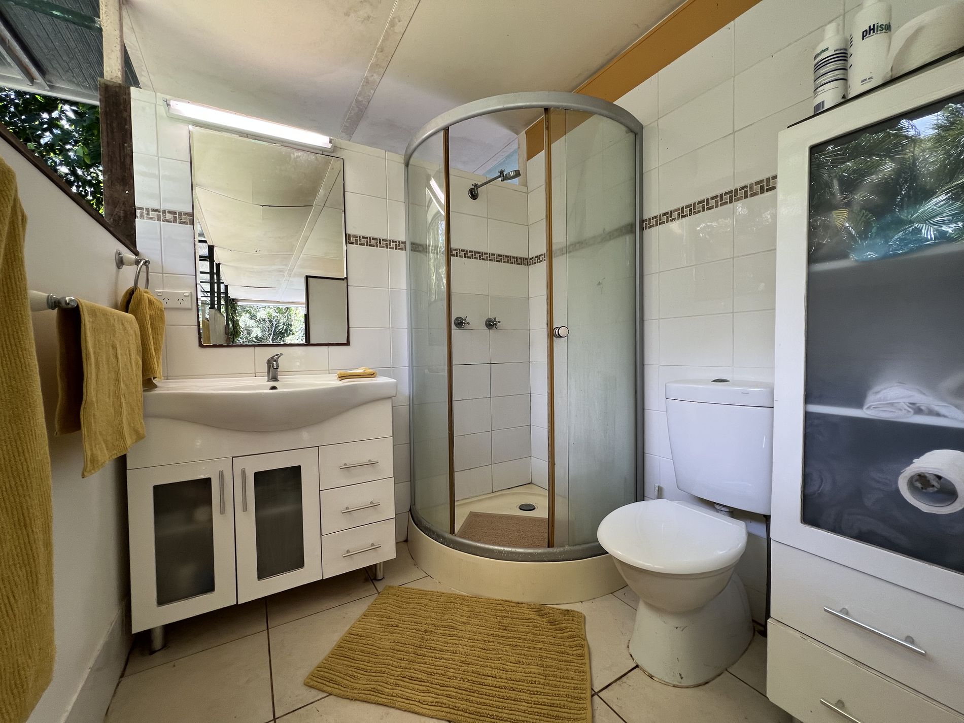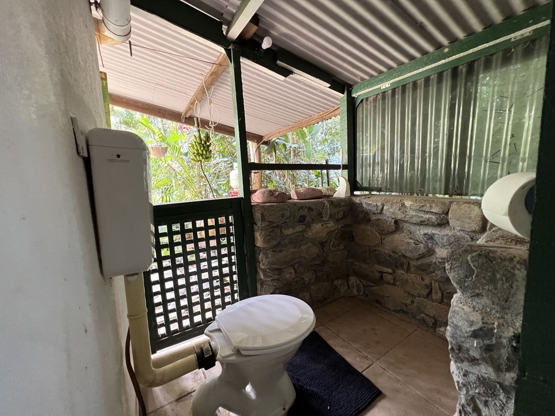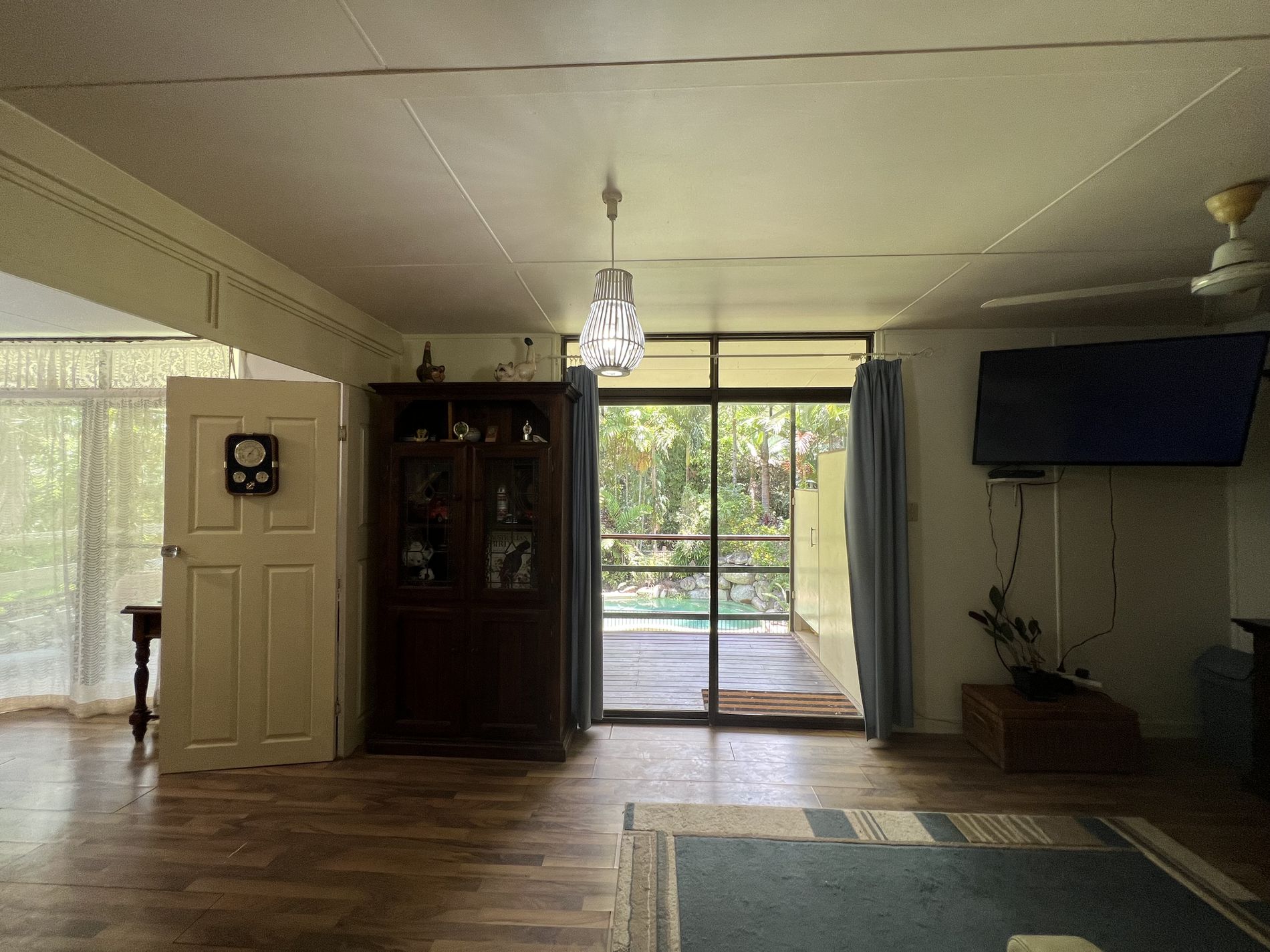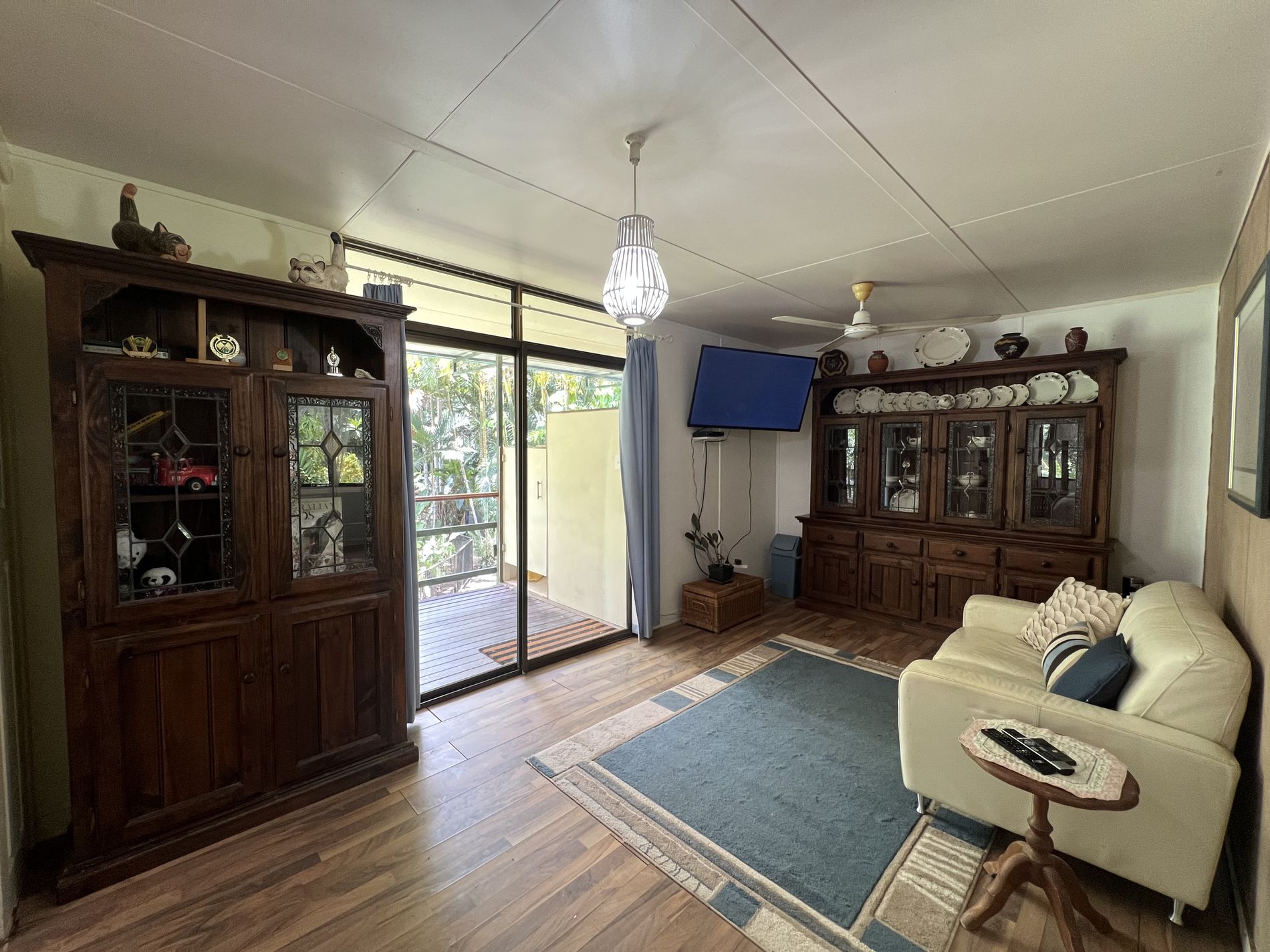 The lower level is constructed with block on a concrete slab with large windows to allow breezes to flow through keeping it cool and catch the natural light. Downstairs also offers open plan living for kitchen, dining, and the lounge. The kitchen has a dishwasher, large 5 burner gas stove surrounded by cupboards for storage or room for a breaky bar. In addition, the walk-in pantry has its own air-compressor pumping cold air and the temaperature can be adjusted to your liking, (similar to a cold room) for optimum storage. Adjacent to the downstairs area is the laundry, separate toilet and charming bathtub and surrounds.