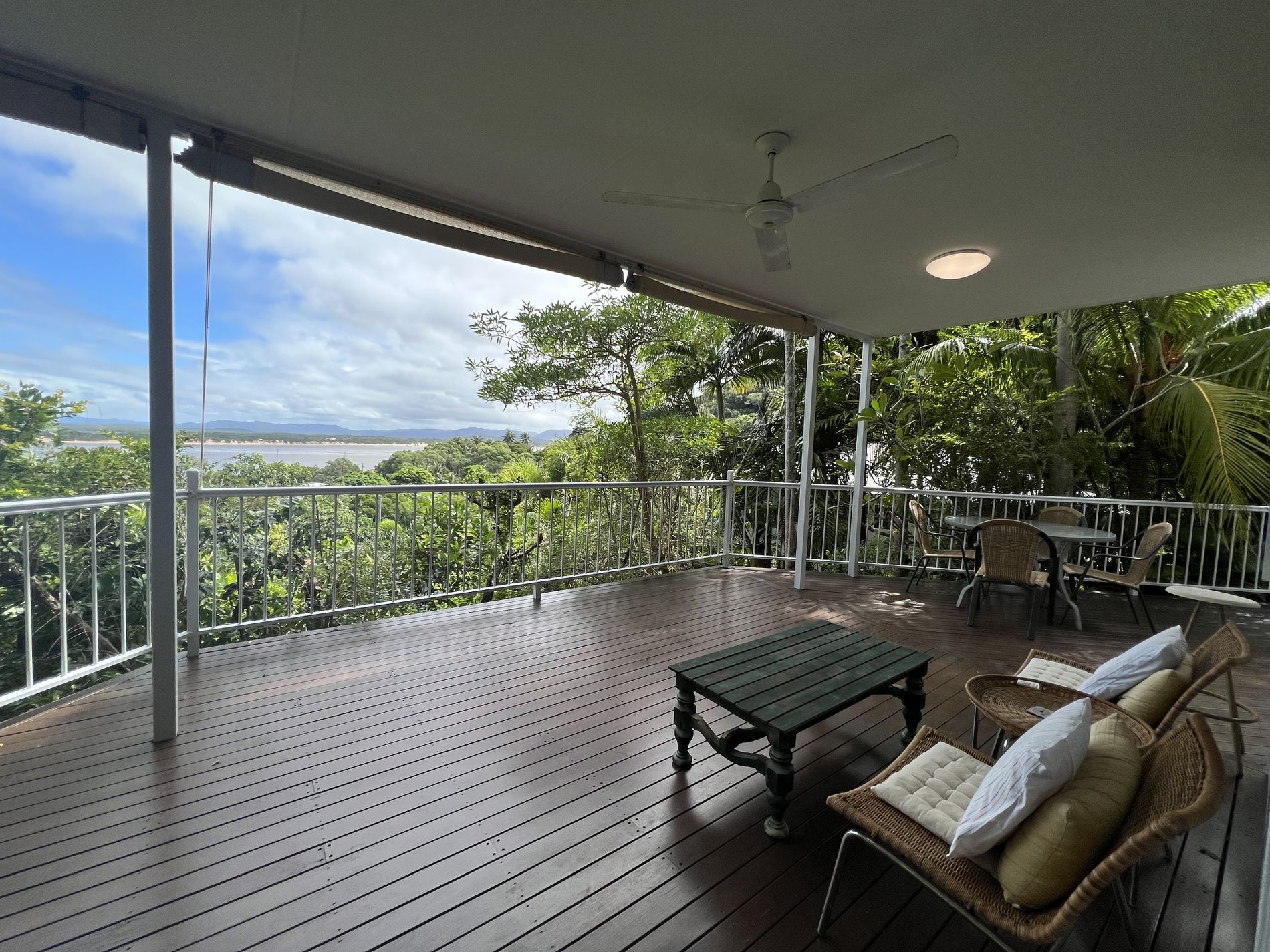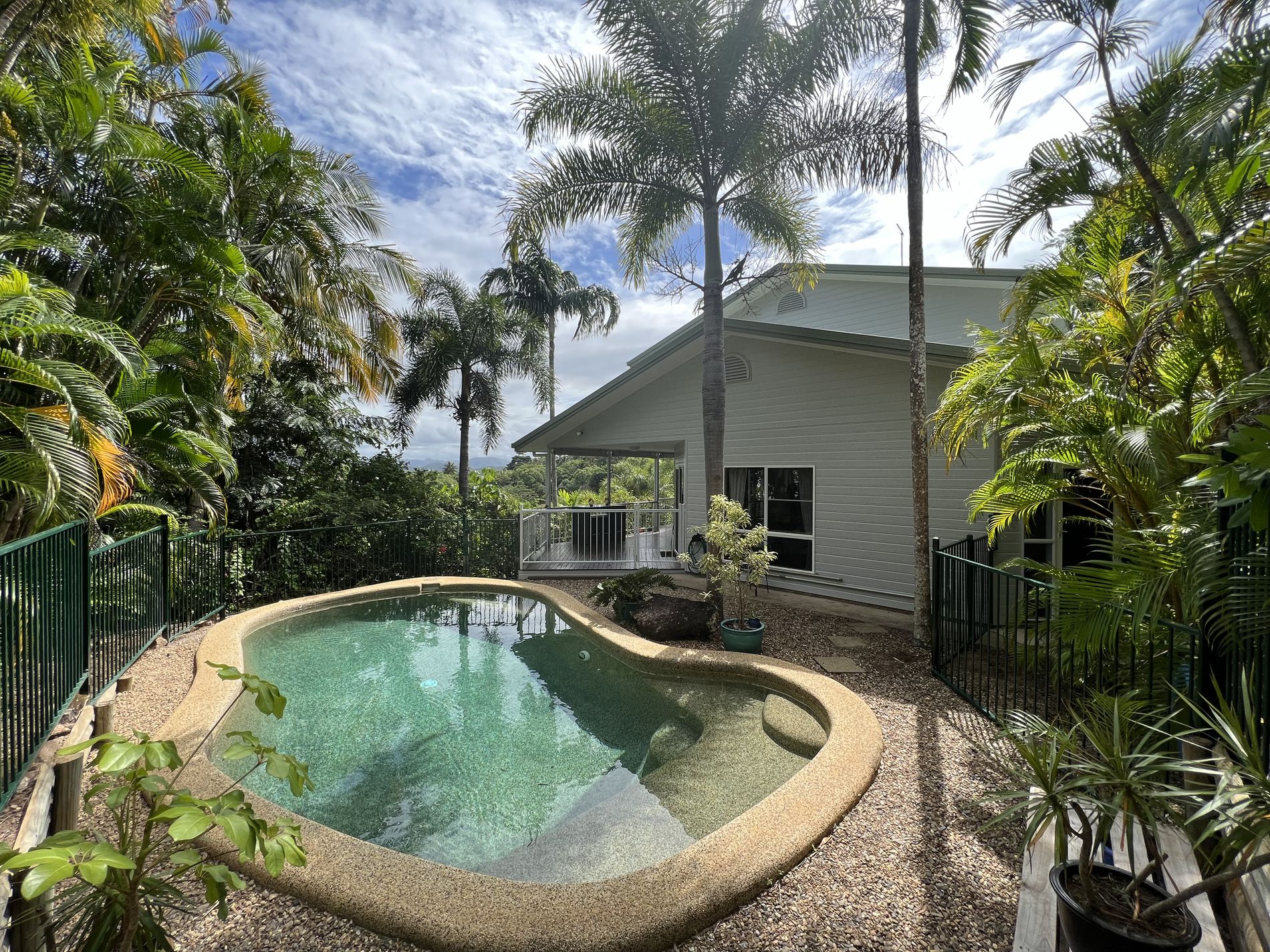 Cooktown Real Estate has the honour to present this luxury home with 3 bedrooms, 2 ensuites and 1 bathroom. Located on the bottom side of Grassy Hill, tucked away on a quiet street. You are welcomed into the property by tropical gardens and concrete driveway that leads to your carport. The paved pebbled walkway leads you to your front door and front entrance to your pool. Enter your aesthetic open plan living area, which is tiled throughout with the large kitchen adjoining. The kitchen presents a double sink with views, dishwasher, 4 burner gas cook top and oven, ample cupboard space and a pantry. The great design and layout of this home makes for great entertaining with the home opening onto the large deck with glistening views of Cooktown’s Endeavour River and Harbour. The inground pool is accessed by the deck or front entrance amongst landscaped surrounds with tropical plants and palms that also provide some privacy.