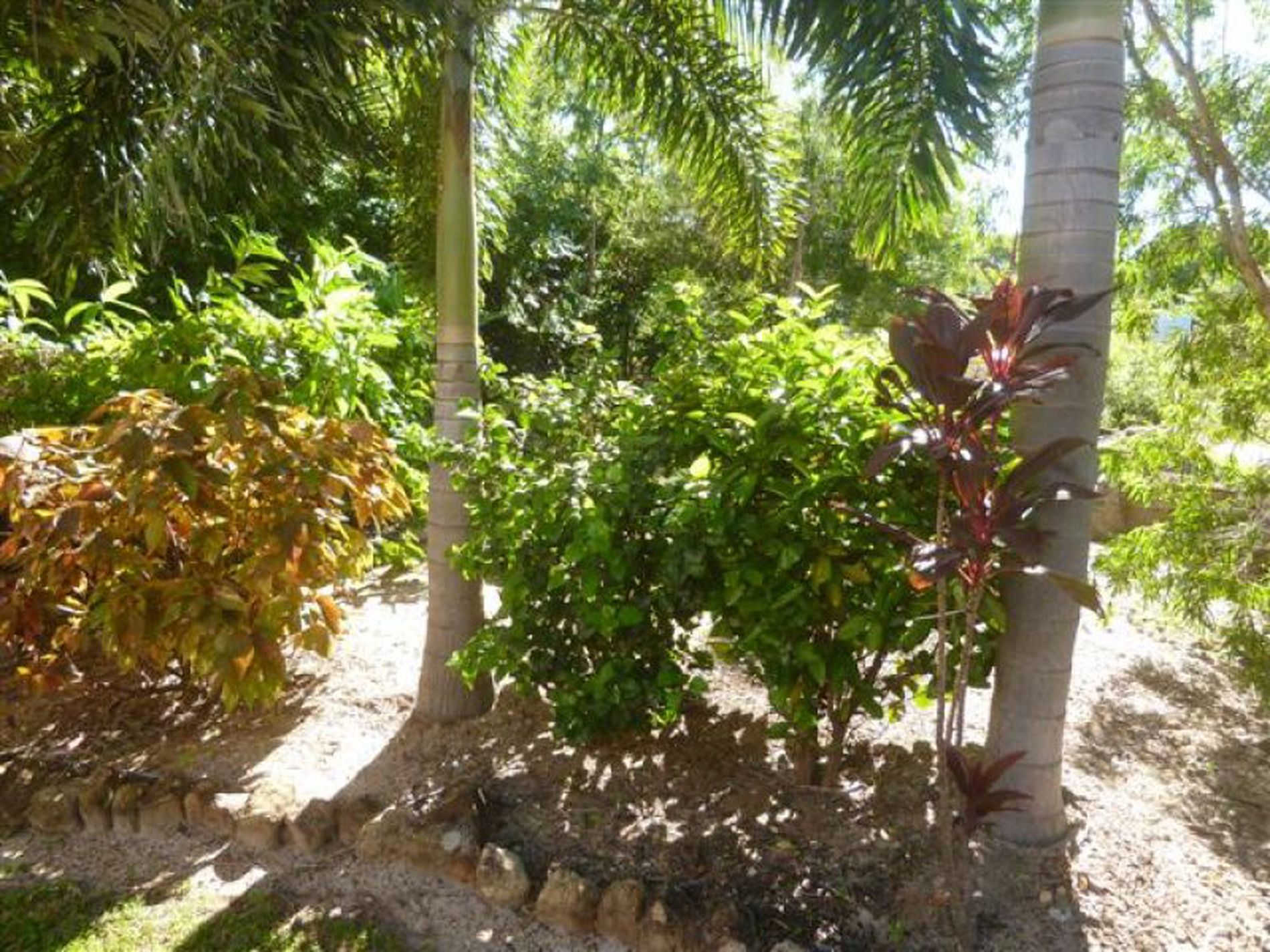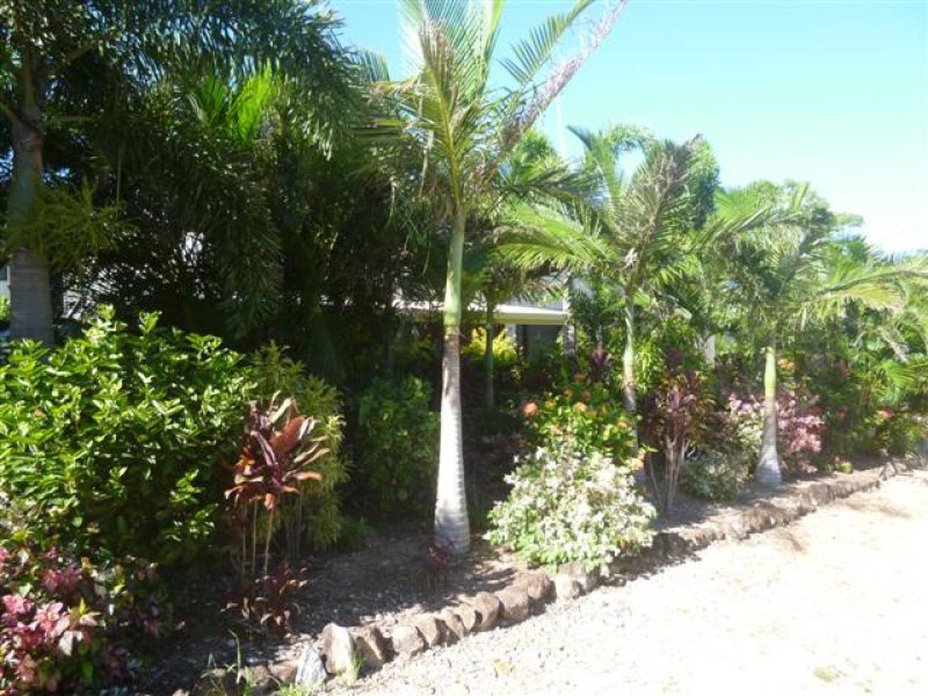 A corridor of tropical flowering shrubs and trees affords privacy from the road.