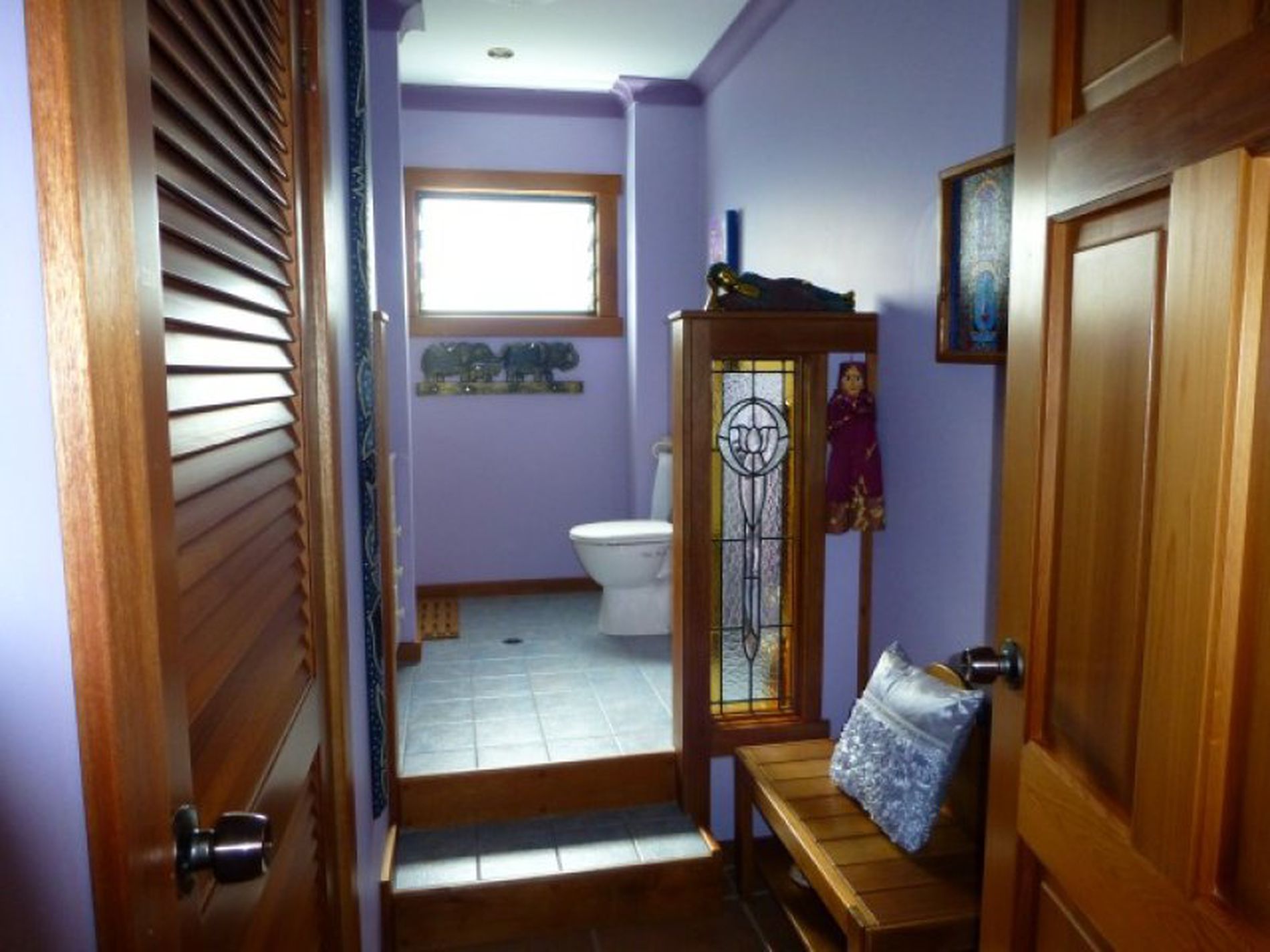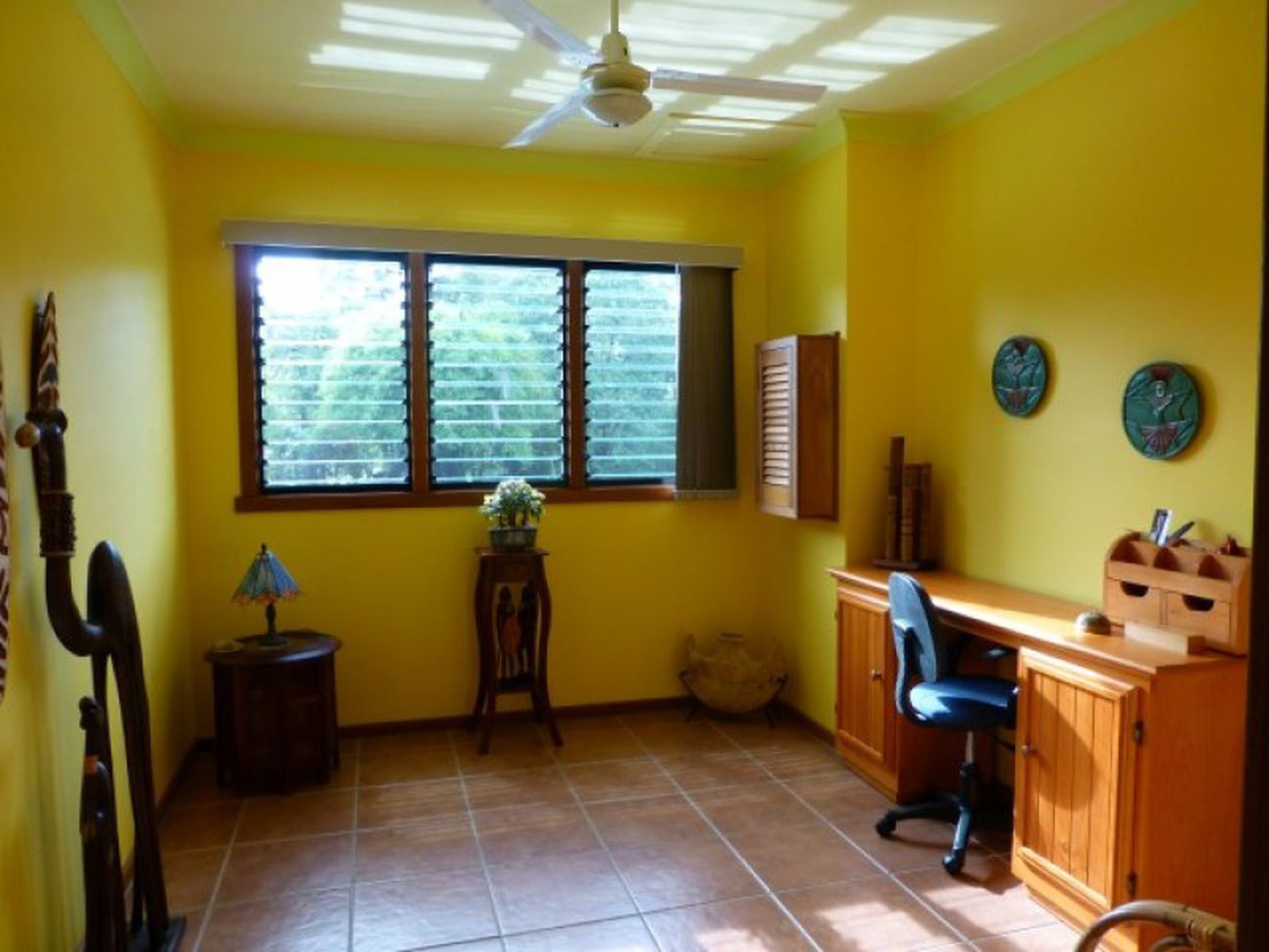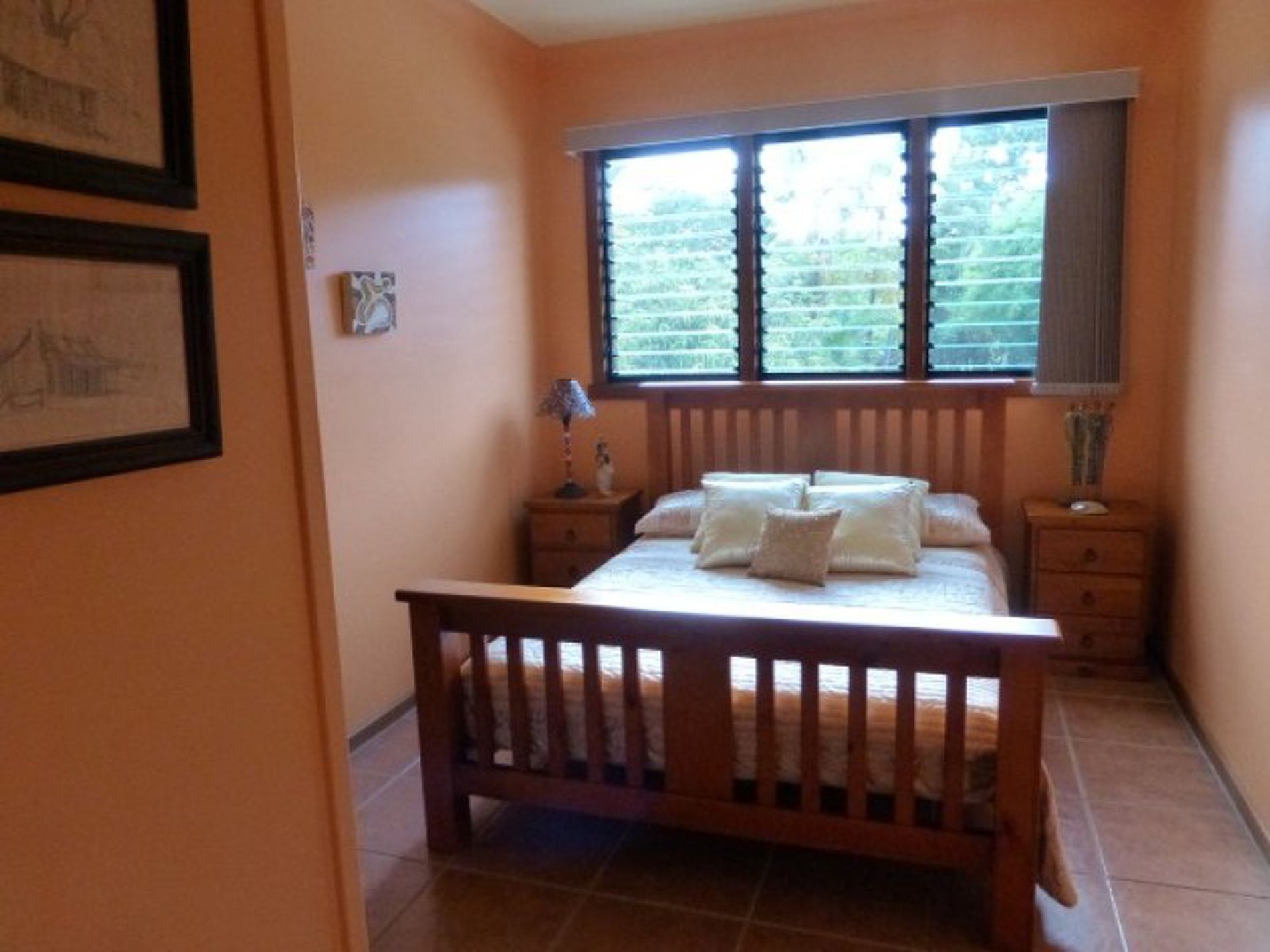 The master bedroom has a rainforest timber ceiling and double french doors opening onto it's own patio and private garden.