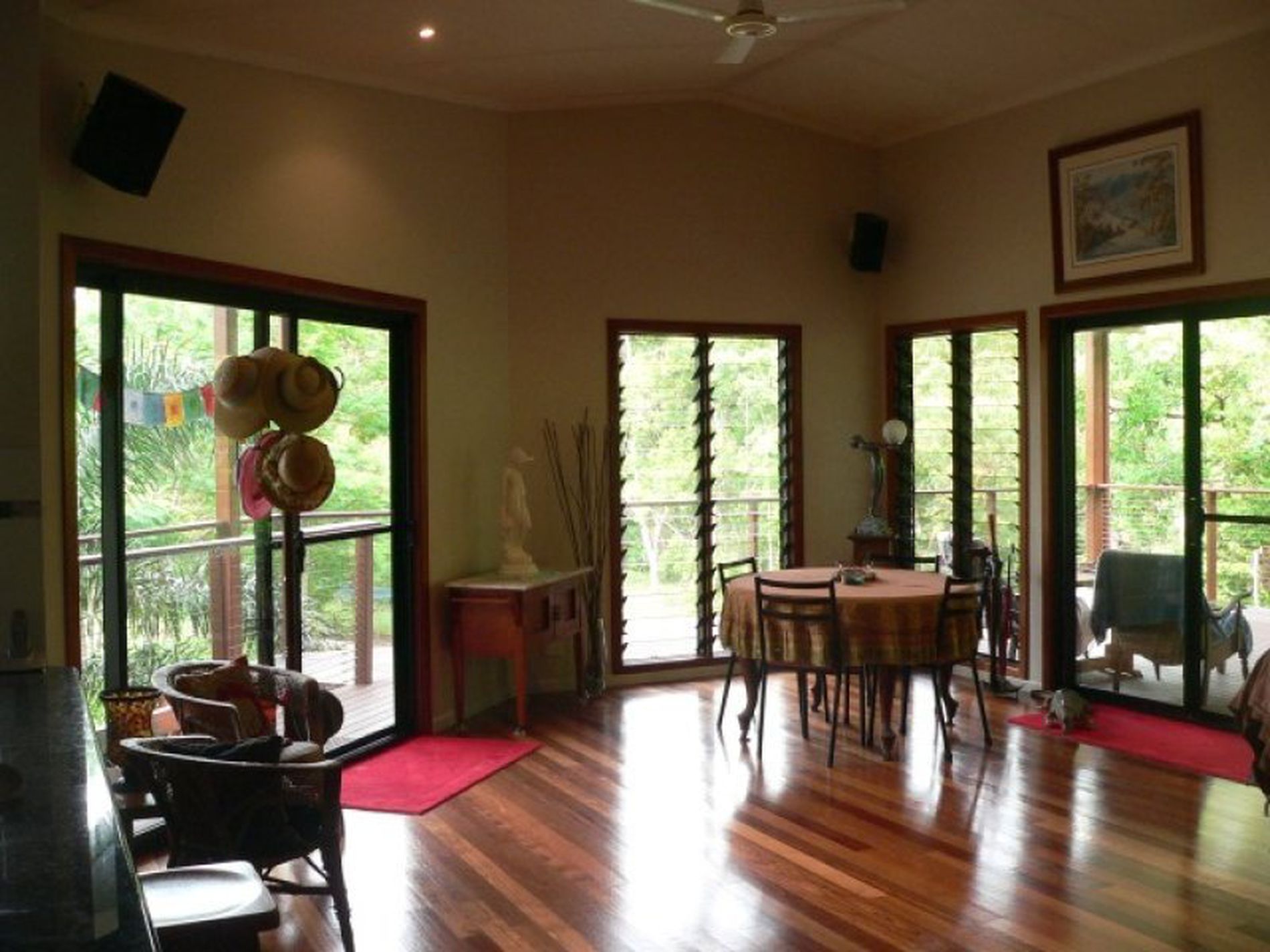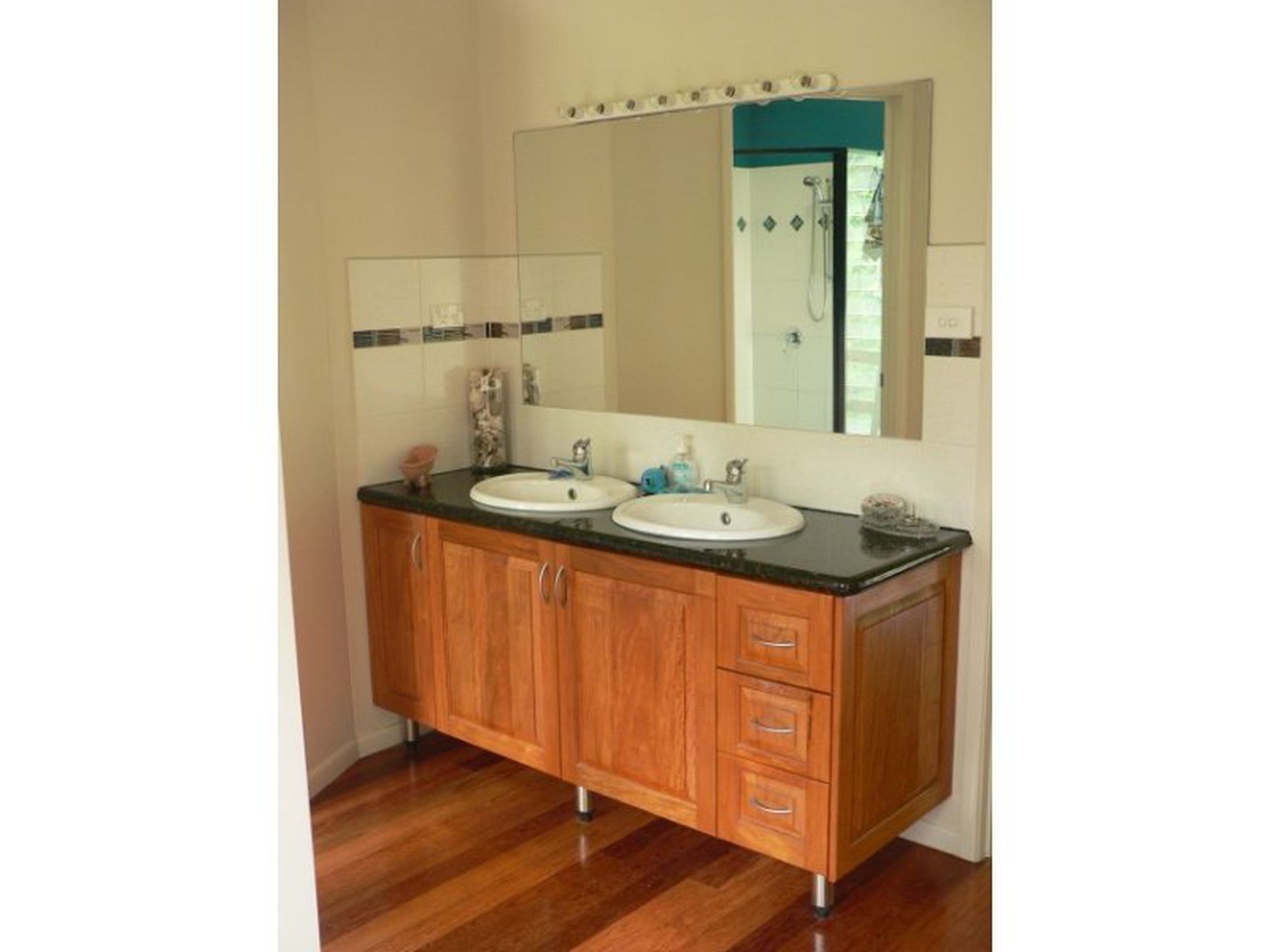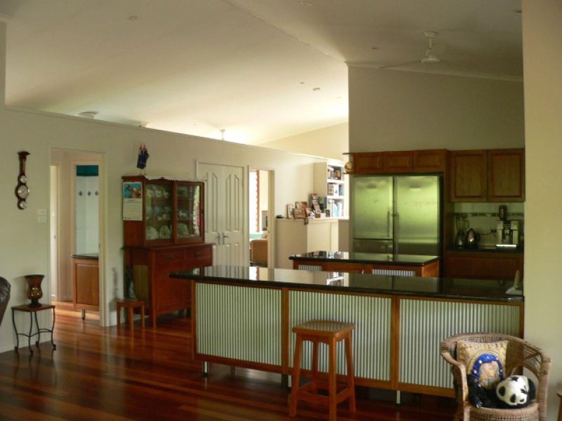 The kitchen boasts granite bench-tops with an island bench, large pantry, Ilve 4 burner gas stove with Tepenyaki Plate & Full Exhaust Fan. All cupboards are elevated off the floor for easy cleaning. Beautiful polished timber floors for easy cleaning throughout and extra high ceilings to keep the temperature down in the summer. Built hi-set to catch the breeze and be up amongst the exceptional bird-life.