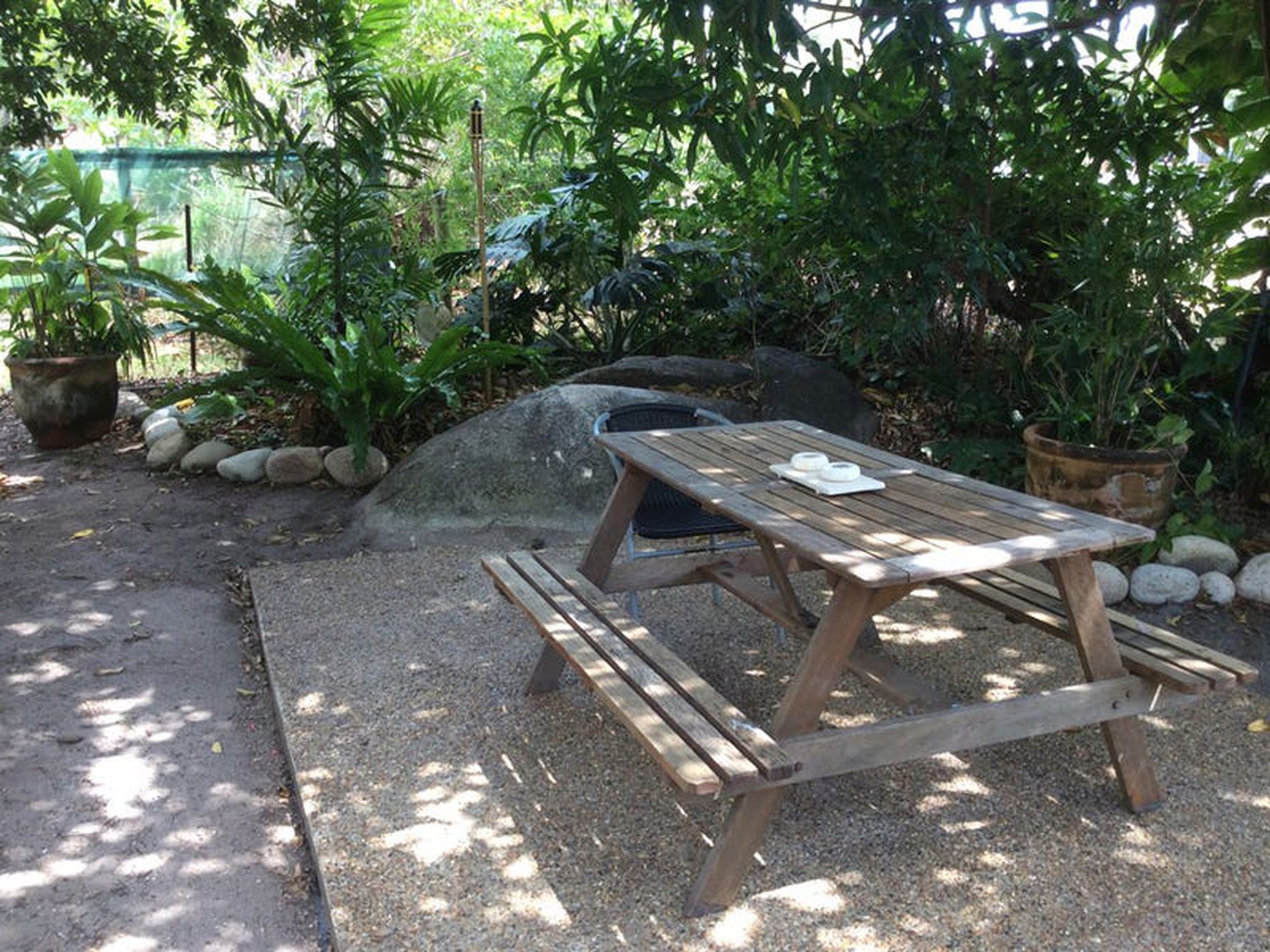 Sit and relax on the outdoor table and chair setting under the canopy of one of the best original and fruiting, Bowen mango trees in Cooktown.