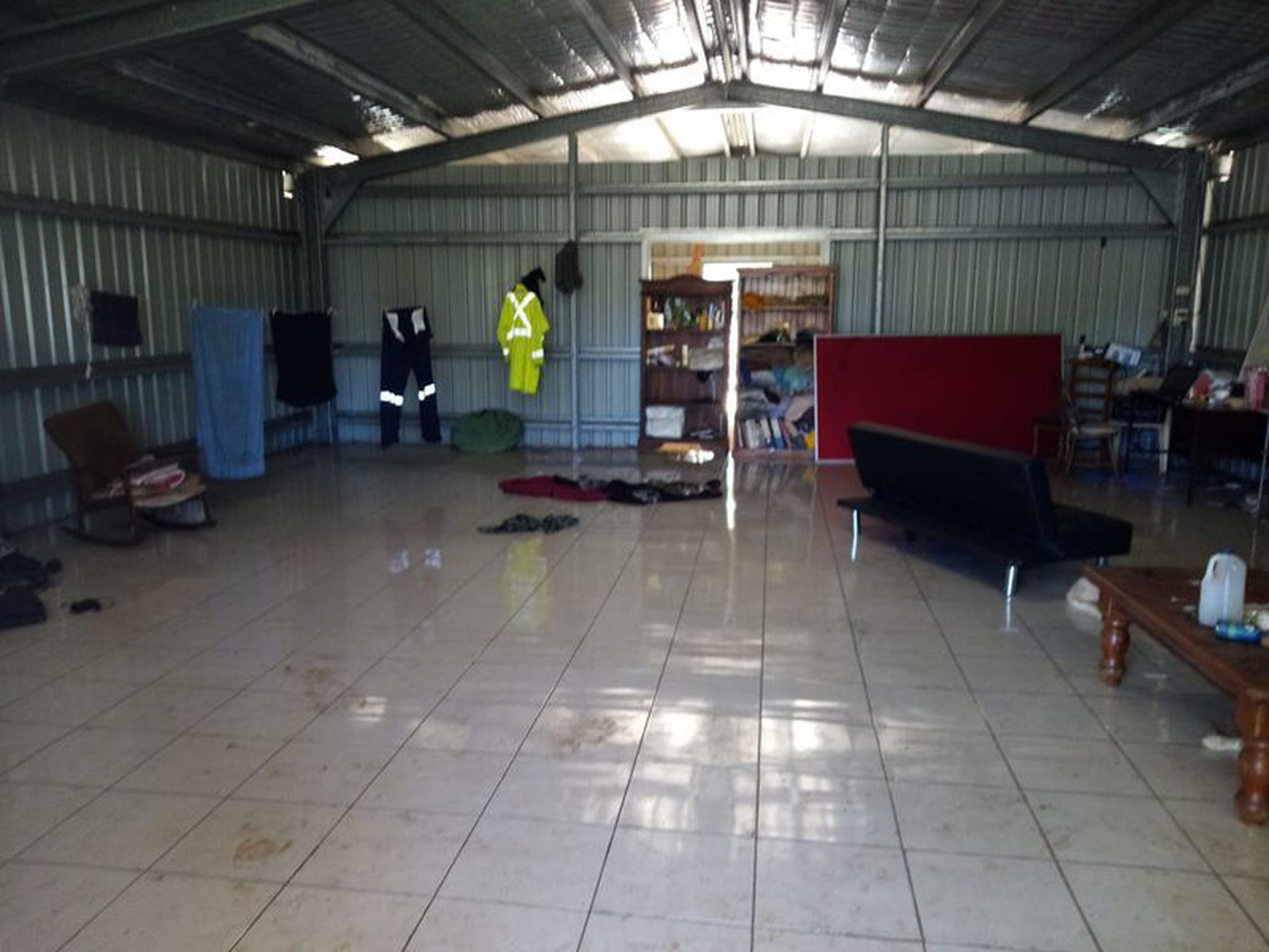 A large shed 9m x 10m with 5m with a wide overhanging roof has been erected on a concrete slab currently being used as a livable dwelling. It features a camp-kitchen with water from the rain water tank. The overhanging roof has been built in on one side for use as potential rooms. A bush-shower is also in place and there is a semi-completed bathroom with a composting toilet.