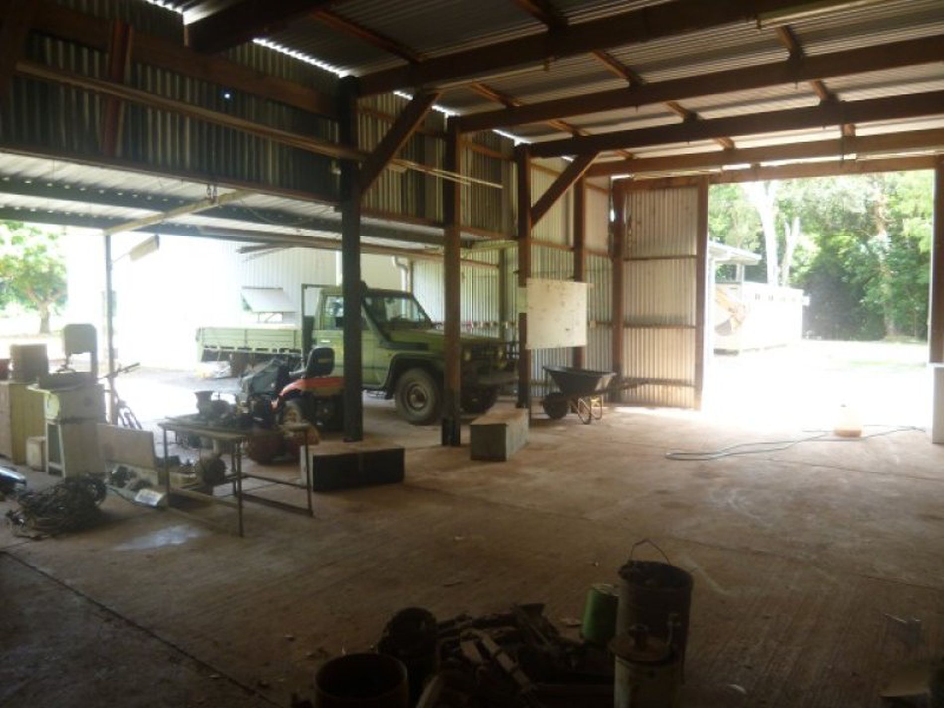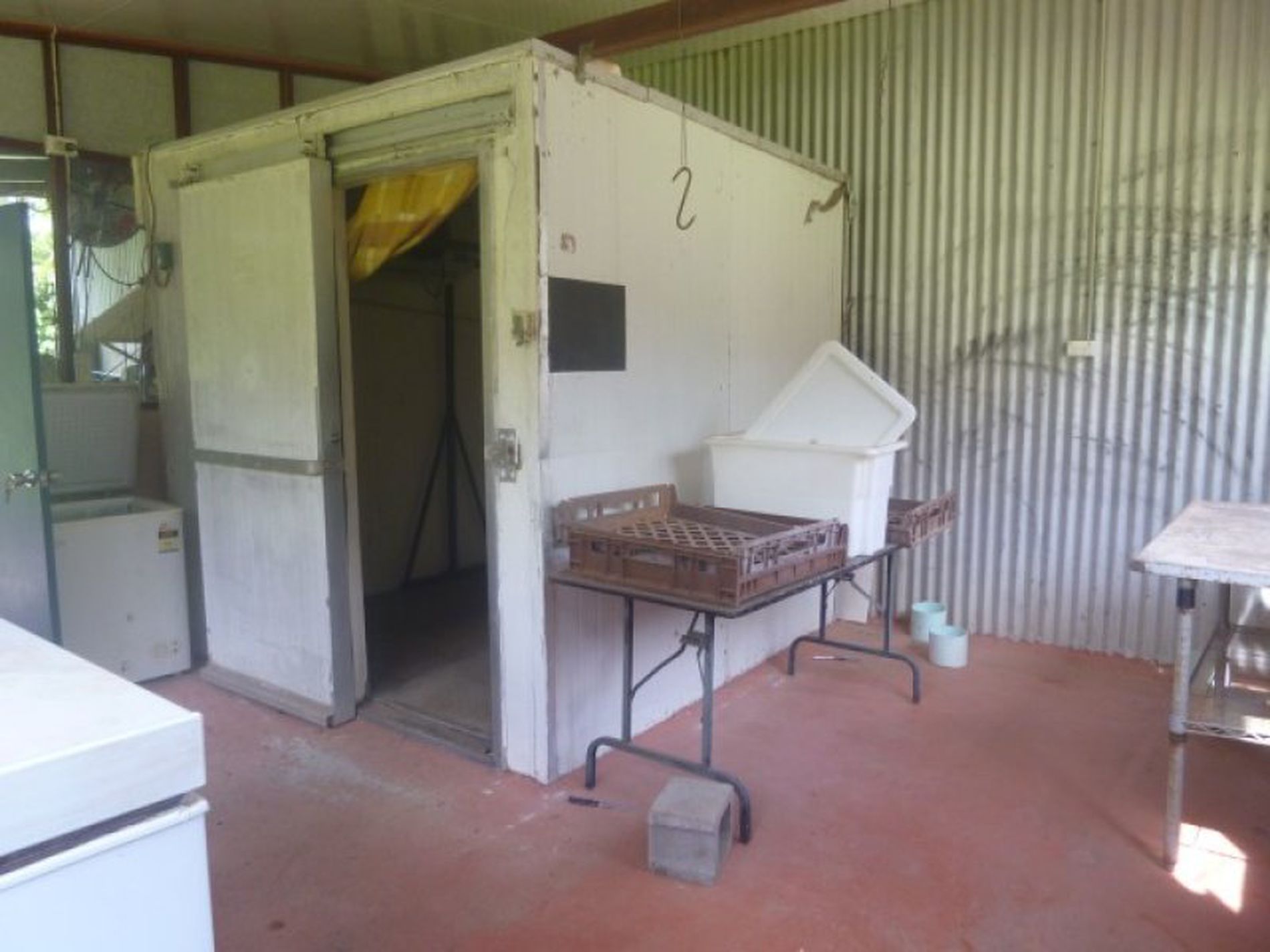 3 huge sheds with parking for up to 8 vehicles or use as work and machinery sheds including your own separate cold room with killing and hanging area, freezer and bench.